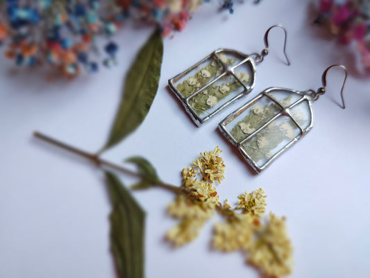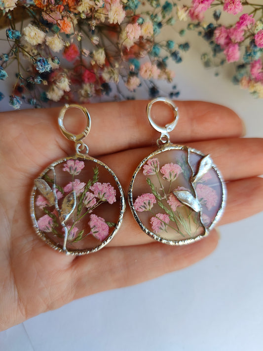 Stained Glass Earrings with pink gypsophila Pressed Flowers | Handmade Botanical Jewelry