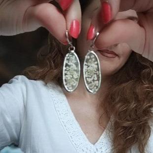 Oval Stained Glass Earrings with White gypsophila | Pressed Flower Botanical Jewelry