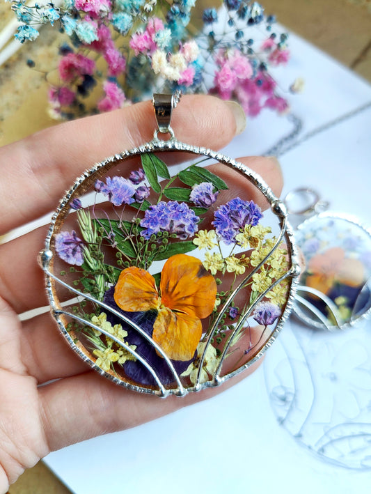 Pressed Flower Pendant and Earrings Set with Viola | Stained Glass Jewelry with Real Flowers
