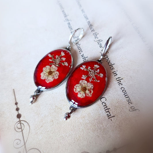 Spirea Earrings | Red Real Flower Dangle Earrings | Stained steel earrings |Pressed Flower Jewelry